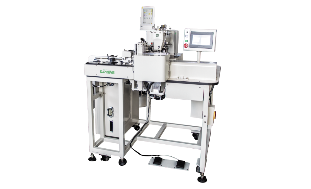 Introducing advanced Panasonic color mark recognition system for double colors elastic stitching, recognizing the position of the LOGO precisely, to ensure the LOGO in the center position against the jointing line, can stitch one big and one small length of elastic in each cycle, very efficiently save the wastage of elastic. It is a milestone to introduce the visual identification system in the sewing industry.