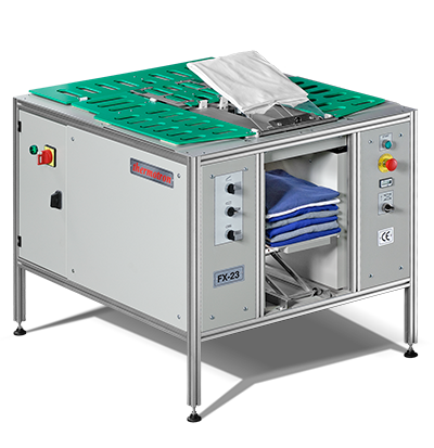 The automatic folding machine FX-23 folds clothes quickly, silentlyand with precision. It functions independently and requires 1 operator. It is designed to fold t-shirts, sweatshirts, sweaters, undershirts, etc. It can be very easily adjusted for the various sizes and types of clothes so that the best desired folding is achieved. The FX-23, apart from the automatic folding, also offers two important options after the garment has been folded.